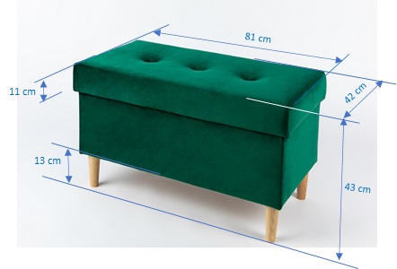 Kuferek wykonany jest z welurowej, miękkiej w dotyku tkaniny w modnym, butelkowym kolorze. Siedzisko wykończyliśmy minimalistycznym pikowaniem, co nadało pufowi eleganckiego charakteru. Posiada czarne nóżki z drewna bukowego. W naszym sklepie masz możliwość personalizacji obicia oraz stopek, tak by mebel idealnie pasował do Twojego wnętrza oraz pozostałych mebli – sofy lub fotela.